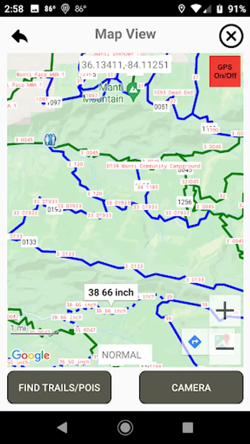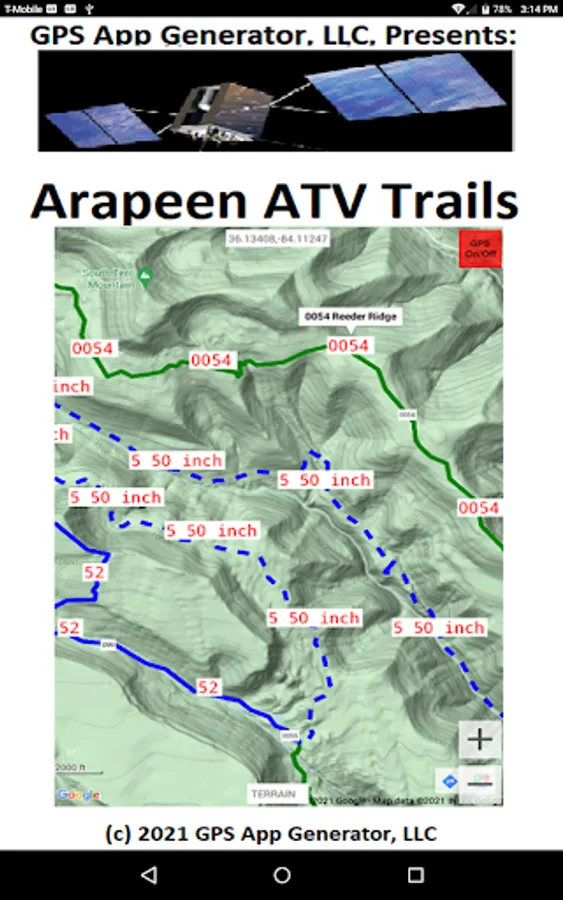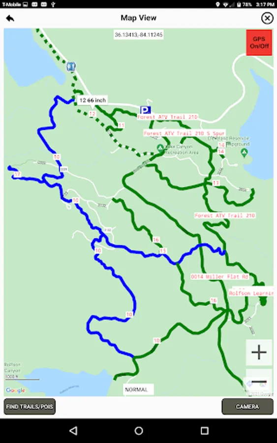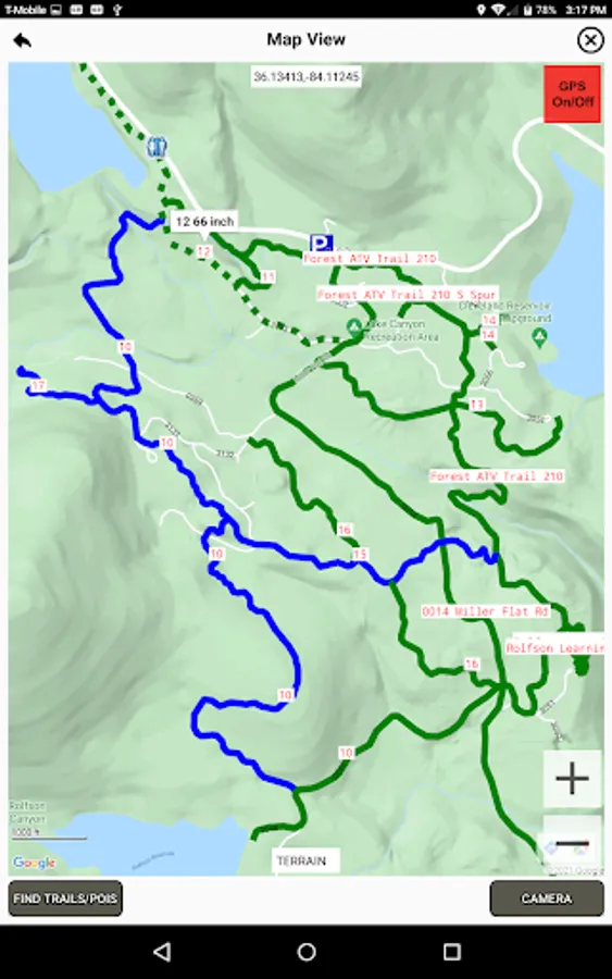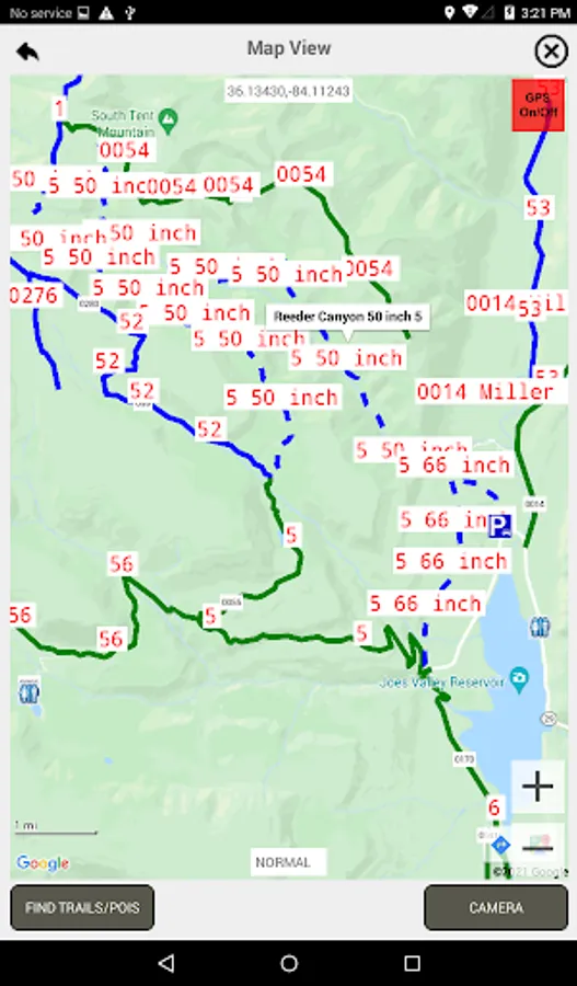 50 and 66 inch trails are dashed and noted in the App. Trails are color coded as to difficulty, but should not be relied upon, as one days weather can change its difficulty, and, vehicle, and abilities of the driver also play a part. Do not go forward on any trail you would not want to go back over. Keep the Trails clean, if you bring it in, take it out.