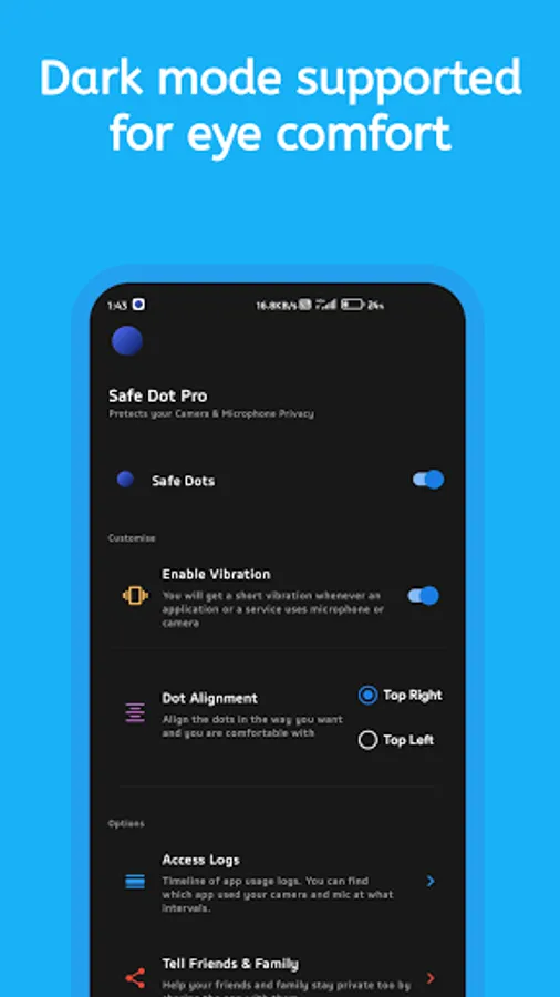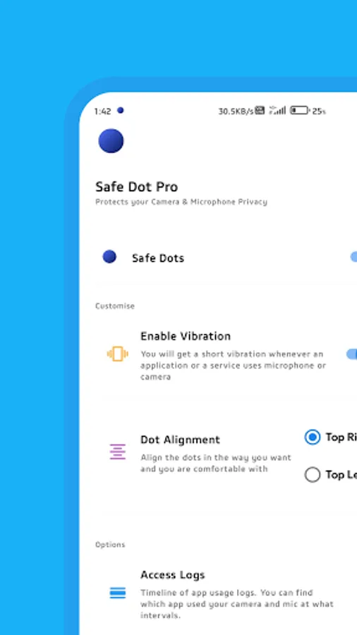 Safe Dot Pro gives you an indication when a system app or a third party app uses your device camera or microphone. Similar to iOS14 feature it shows green dot when camera is being used and orange dot on microphone use.