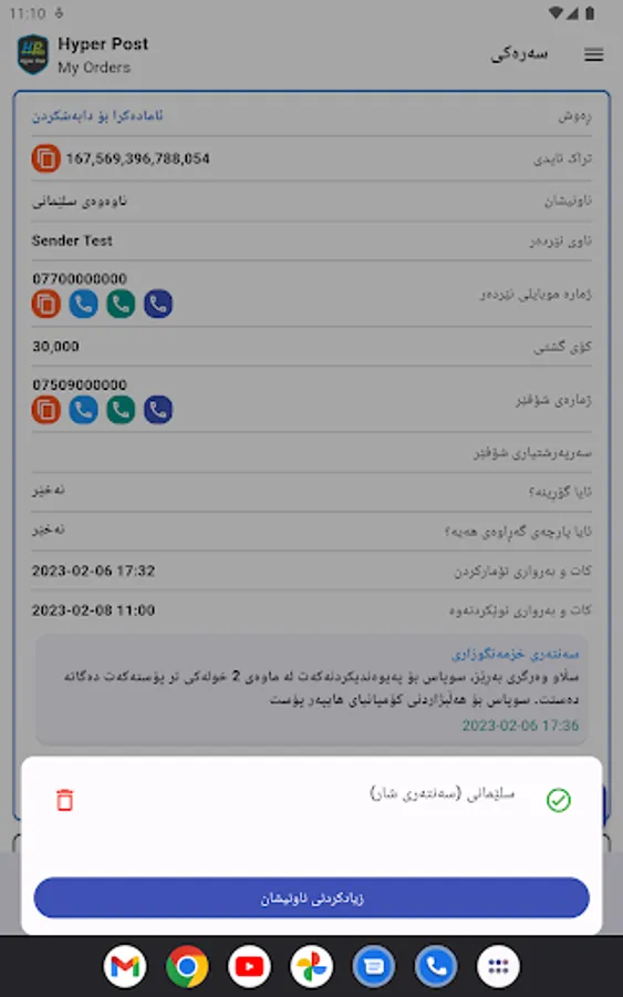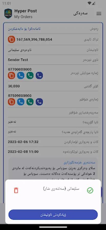 ٤- دەتوانیت کۆمێنت بنوسیت بۆ شۆفێر و نێردەر و سەنتەری خزمەتگوزاری هایپەرپۆست دەربارەی پۆستەکەت.
