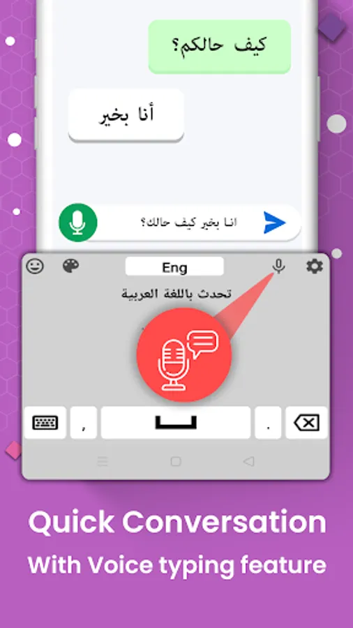 Arabic Keyboard with English, the orderly placement of English, as well as Arabic alphabets, helps you to type both letters easily. Communicate with friends.