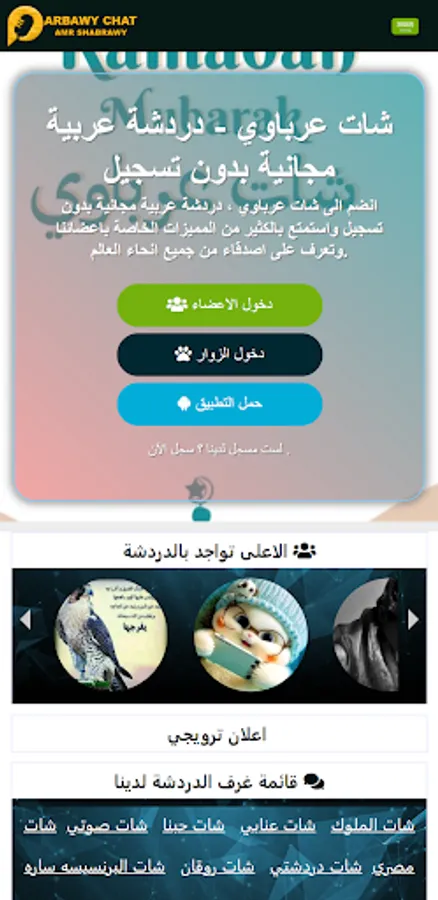 Join the largest free Arab chat without registration, just choose the name you want to enter the chat with, and click on Visitor Login, and you can meet friends from all over the world at any time, and enjoy many of the advantages of our chat when you register a membership with us, To join the list of our large chat members and enjoy complete freedom in communicating with them through group chats in all chat rooms or private chats to talk to each person privately while preserving your privacy in our chats, and because our site cares very much about privacy, we designed a complete encryption system on our site to encrypt each What is specific to the member of important messages and information so that no one can see them except the member himself, even the site’s caretaker cannot view them.
