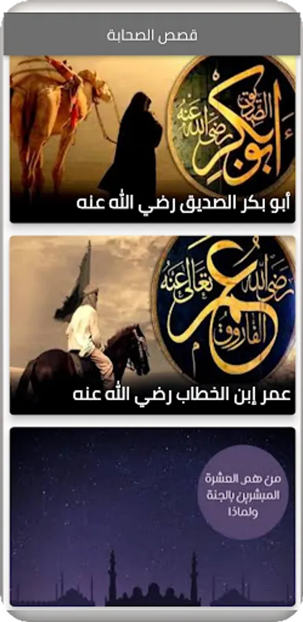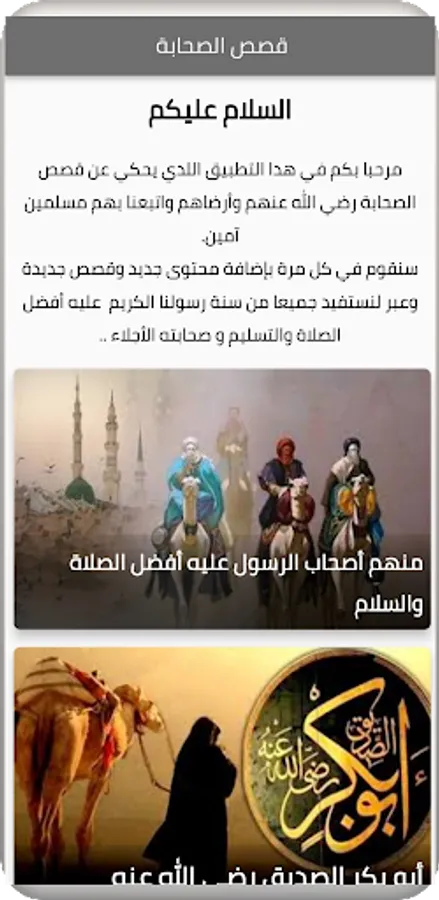 Welcome to the application of stories about companions. Inside the application, you will find a set of information about the life of the Companions, stories about the Companions, the Companions’ style of dealing with life, the biography of the Companions, the Companions’ Islam, painful stories of the Companions, and other information that the believer can benefit from, may God guide us and you
