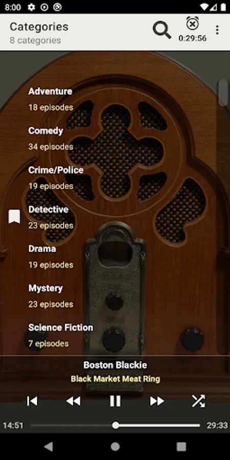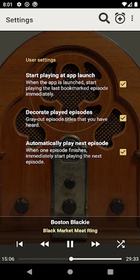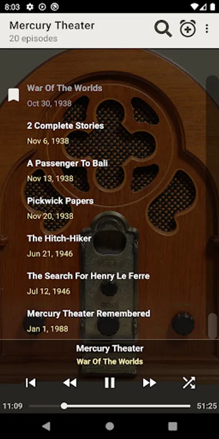 The app automatically bookmarks your current show so you dont have to remember what you were listening to last.