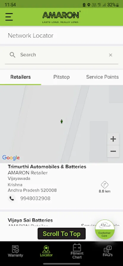 Network locator: Battery breakdown? No problem. AMARON KONNEKT APP will help you navigate to your nearest AMARON pitstop or retailer for AMARON battery sales and services