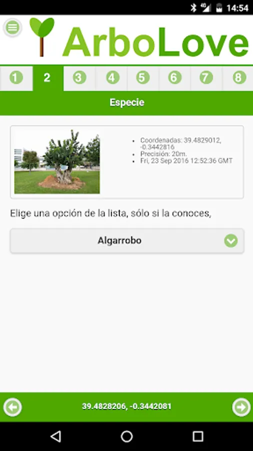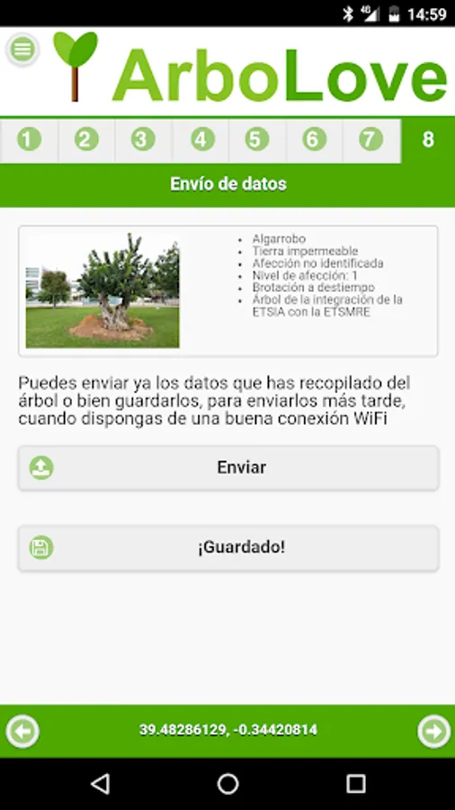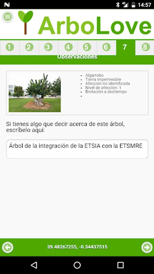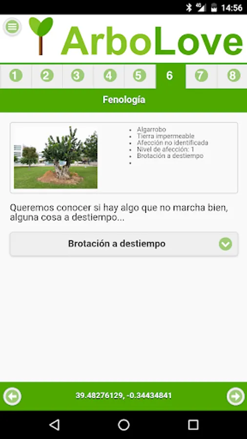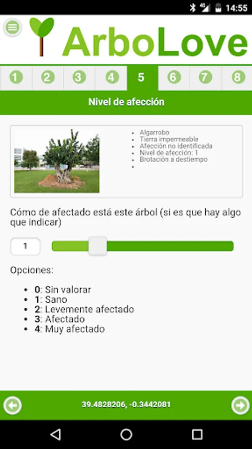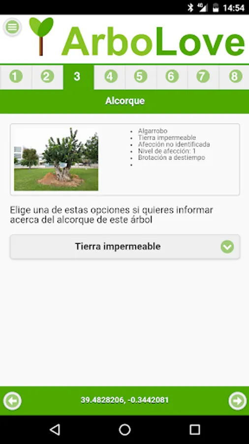 Through this application, a geolocated image of the tree can be uploaded to the Crop Protection server, while other parameters are collected, such as the condition and its level, the state of the tree pit, phenological parameters and particular observations.