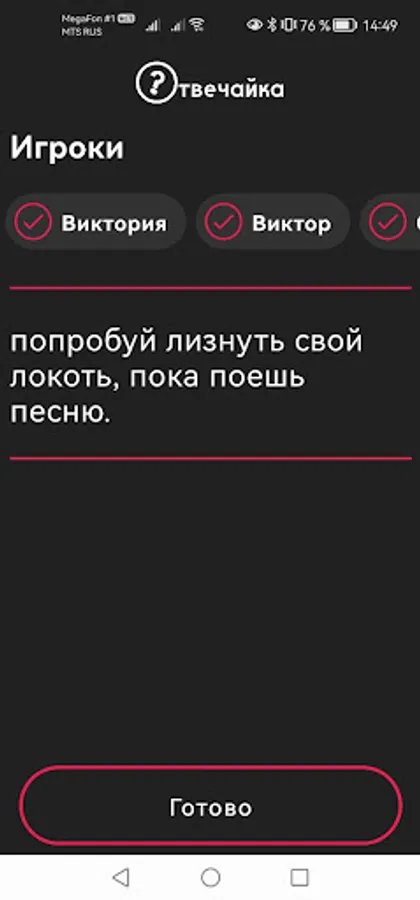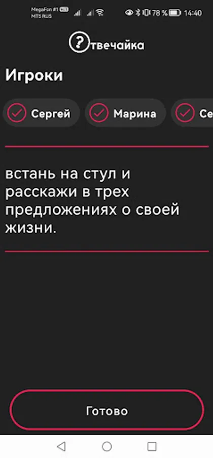 Игра формата "Я никогда не","Правда или действие", где каждому игроку нужно ответить на вопрос, а игрокам, ответившим нет, выполнить задание