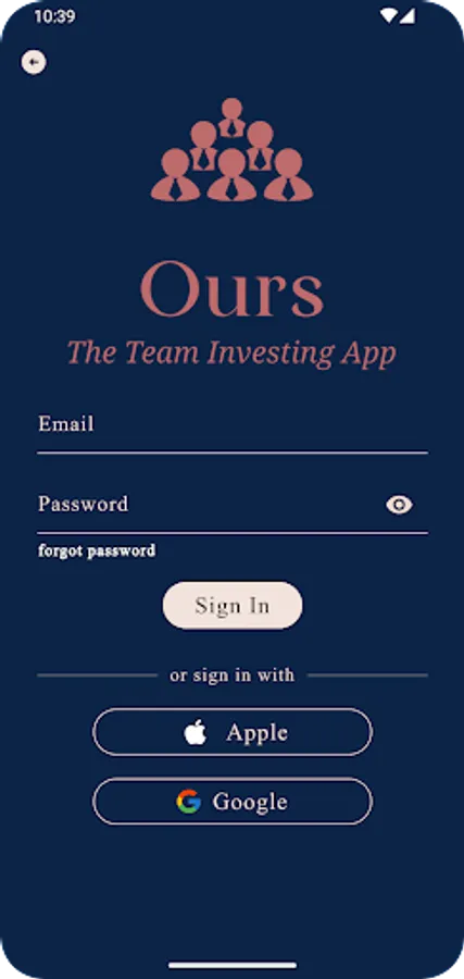 OURS offers a seamless and secure login experience through three options: Apple ID, Google account, or a traditional password-based login. This smart login feature simplifies the onboarding process and ensures users can access their investment portfolios effortlessly. Whether they prefer the ease of social media authentication or the familiarity of a password, OURS accommodates every user's preference, providing a frictionless start to their investing journey.