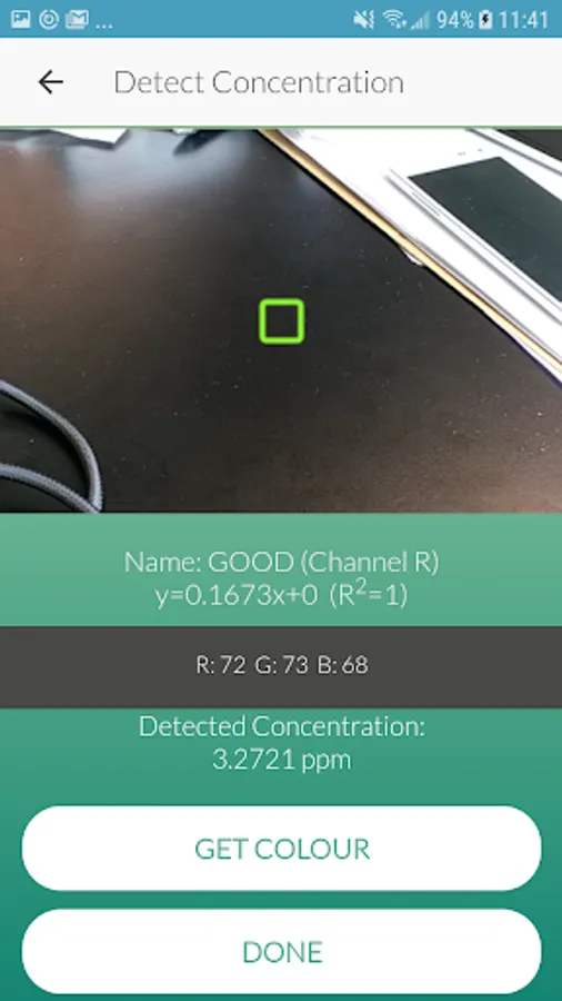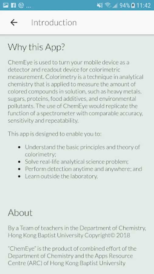 ChemEye is used to turn your mobile device as a detector and readout device for colorimetric measurement. Colorimetry is a technique in analytical chemistry that is applied to measure the amount of colored compounds in solution, such as heavy metals, sugars, proteins, food additives, and environmental pollutants. The use of ChemEye would replicate the function of a spectrometer with comparable accuracy, sensitivity and repeatability.