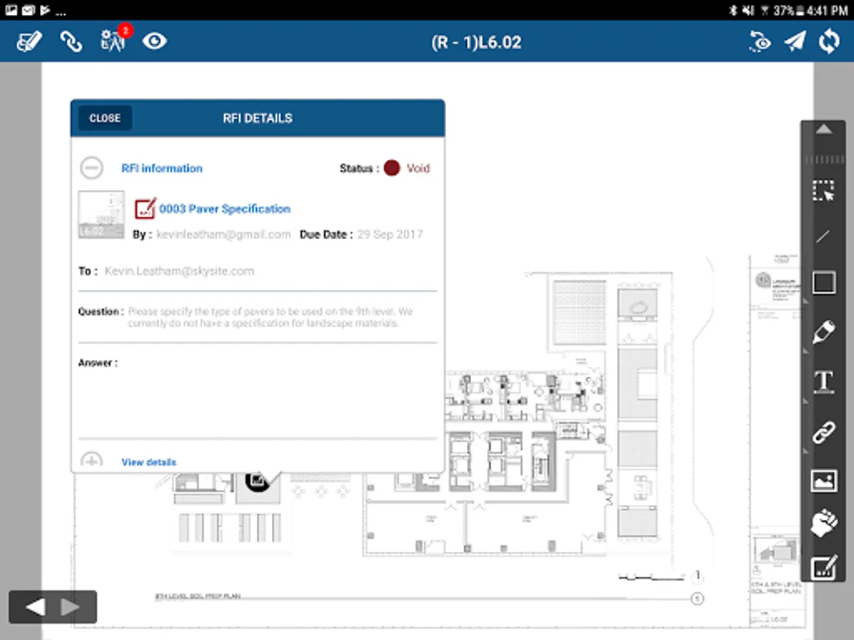 This construction app allows you to version your drawings and specs by the revision date as it shows on the title block of your documents. SKYSITE’s "Latest documents" feature automatically creates the current drawing set for your project. Markups automatically sync to all users in real time. Upload and store unlimited documents. Offline sync lets you view documents, markup, create punches and RFIs, all while you are still at the jobsite, even without internet access.