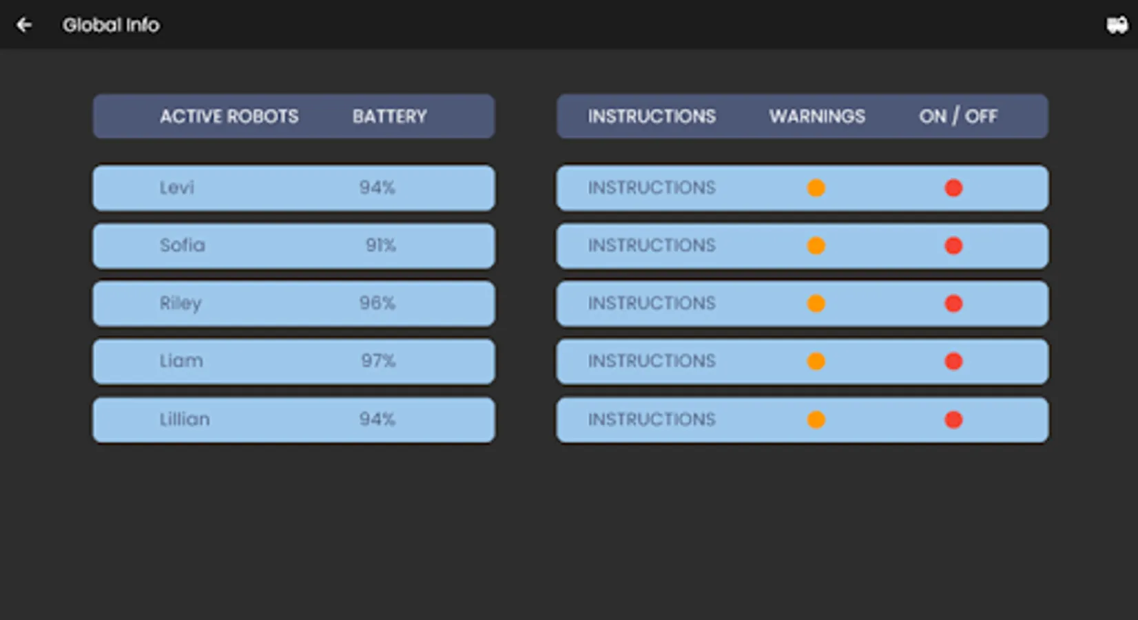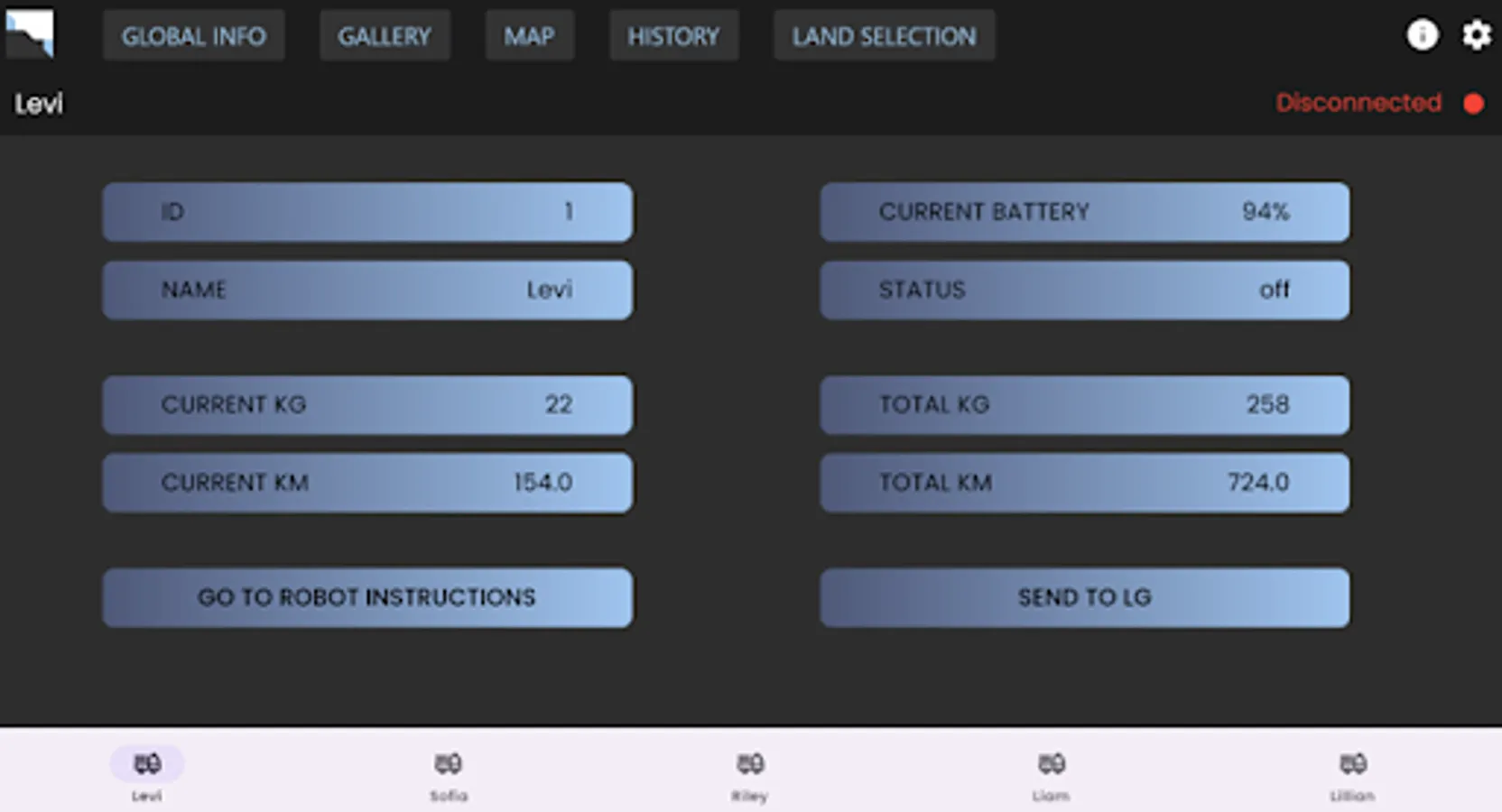 In the dashboard, the farmer can visualize information of their robots, its battery, the status, images…