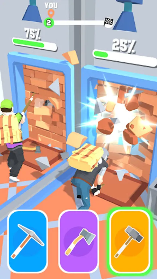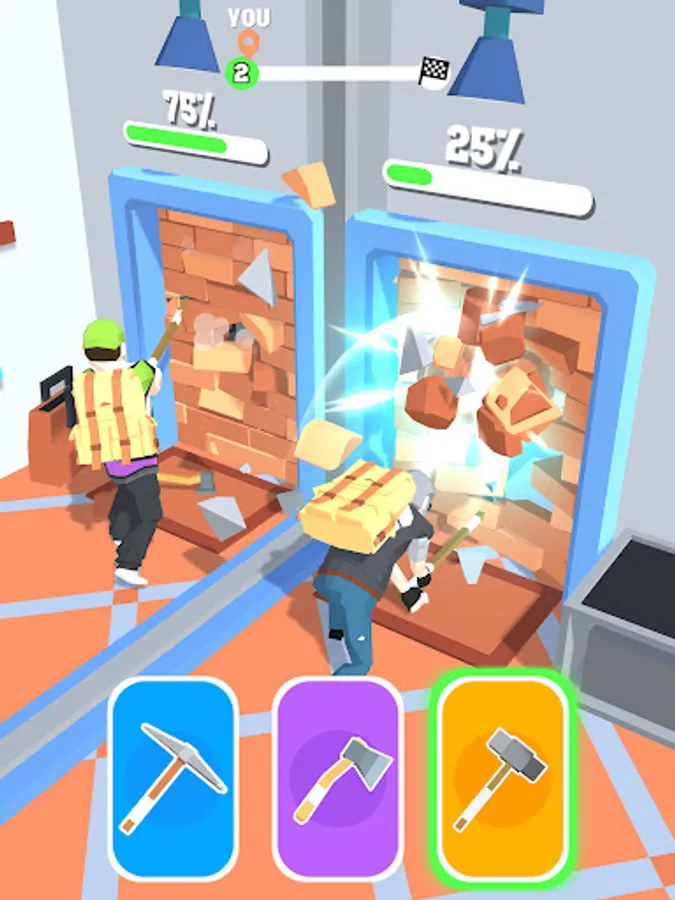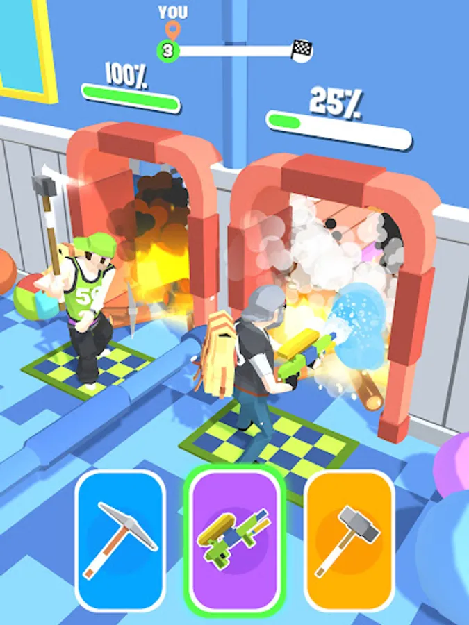 You participated in a broken game. There are many gates on the way to the end point, you need to choose the right props to destroy them. Be sure to reach the end more earlier than your opponent.