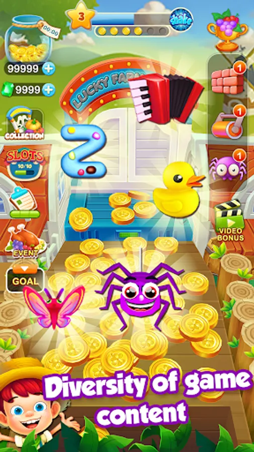 In this epic free dozer game, you will play as a little boy named Ethan who wants make efforts to repair grandpa's farm. Try to push off as many as shiny coins as you can, enjoy the fun with more and more coin collection. During pushing, more than 50 super fine collections will appear on the board, collect them set by set, win bonus abilities for you.