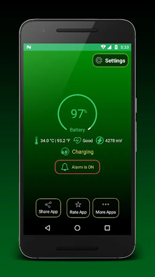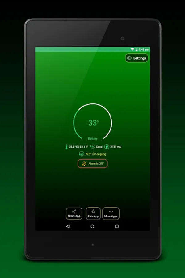 App will show notification when battery charged to 100%. Battery Notification also shows battery level, battery temperature and voltage information.
