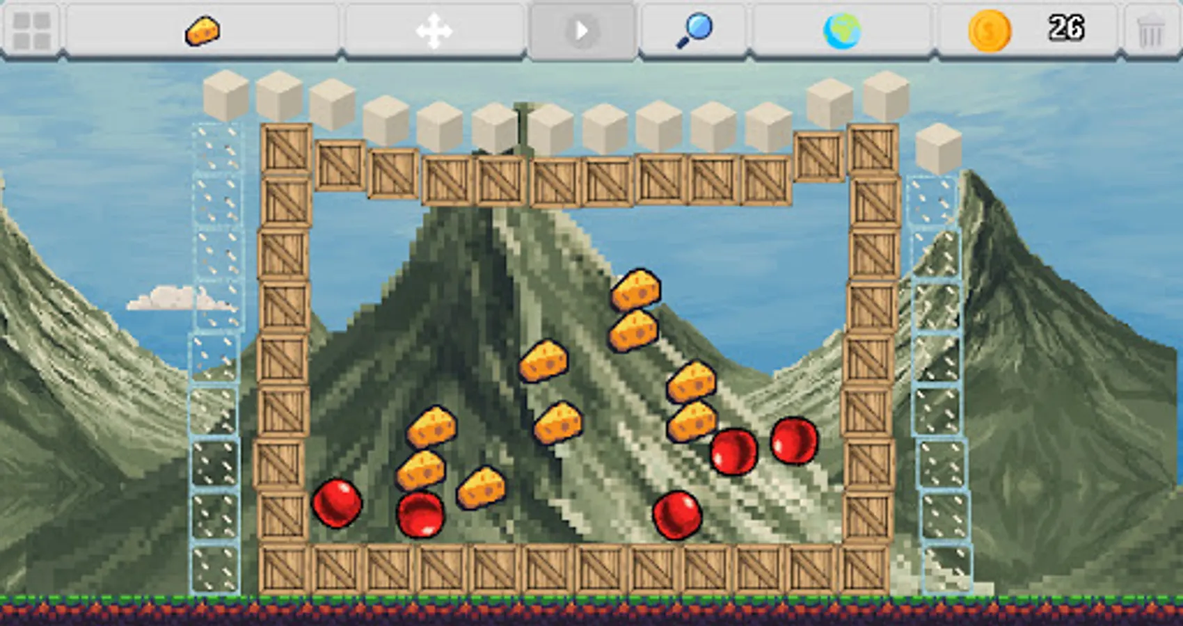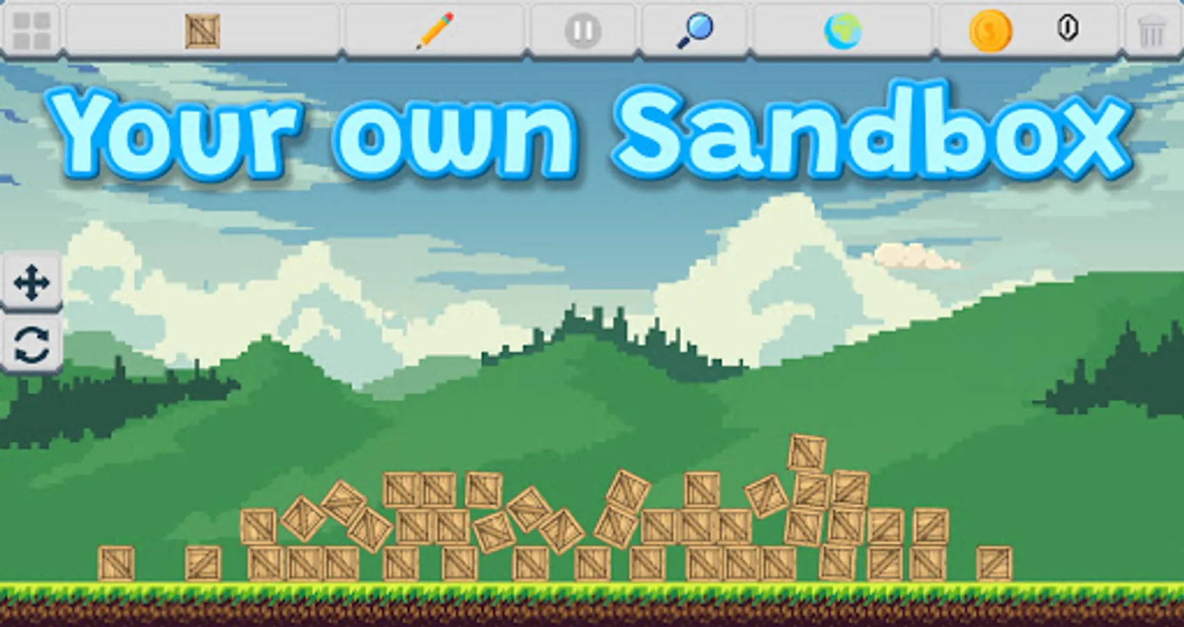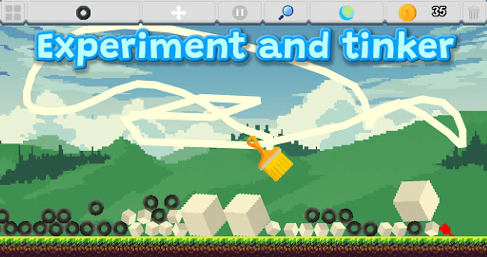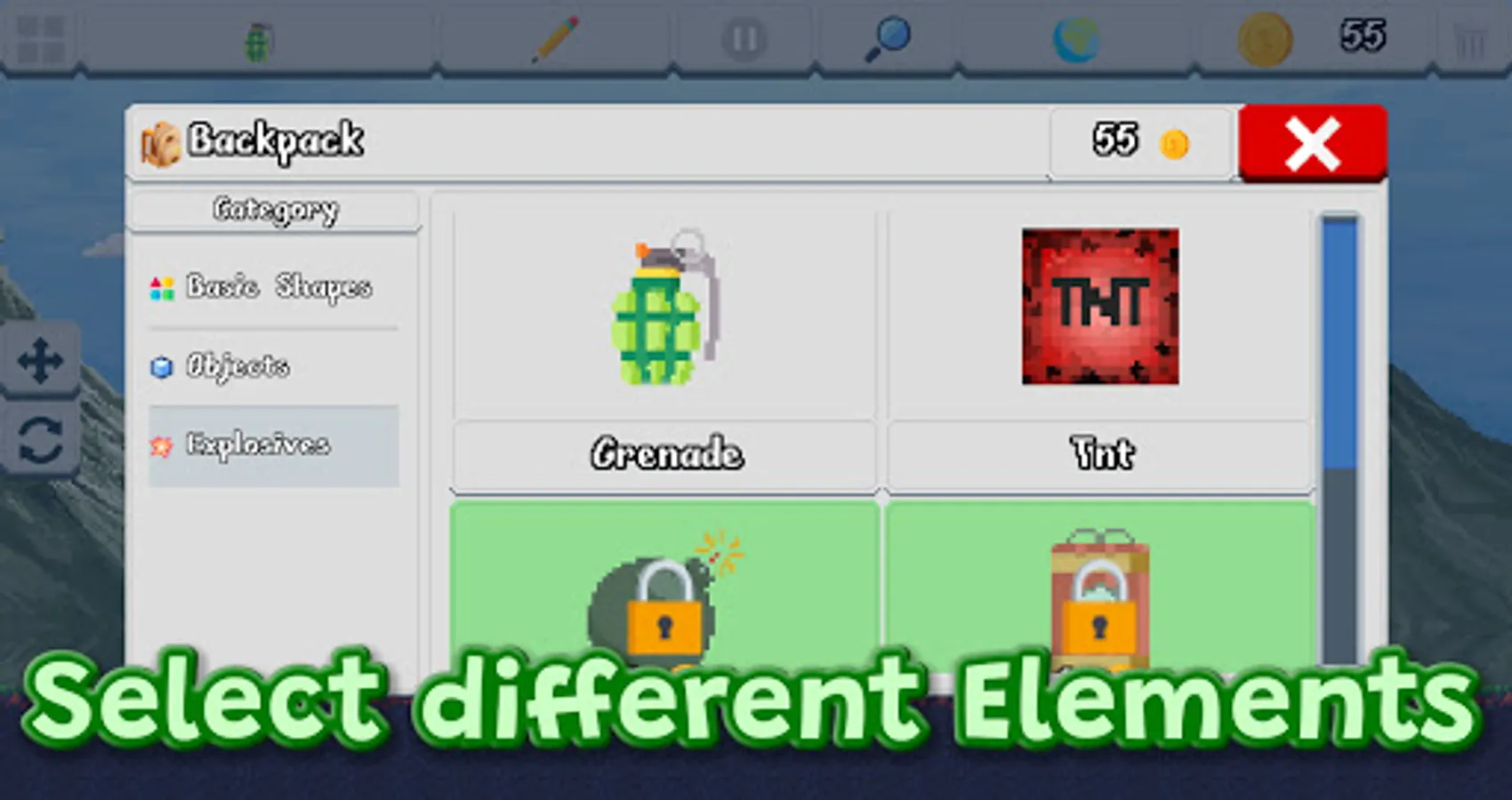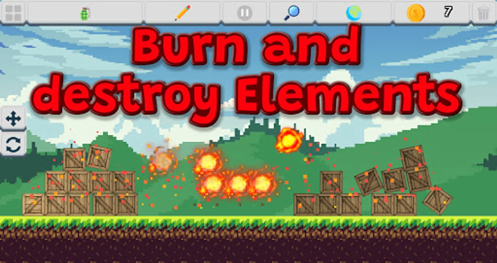 Open your backpack and select from various elements. Tap anywhere to spawn elements in the world. Select different tools from your toolbox and tinker in your own sandbox. Burn and destroy elements to collect coins and purchase new elements.