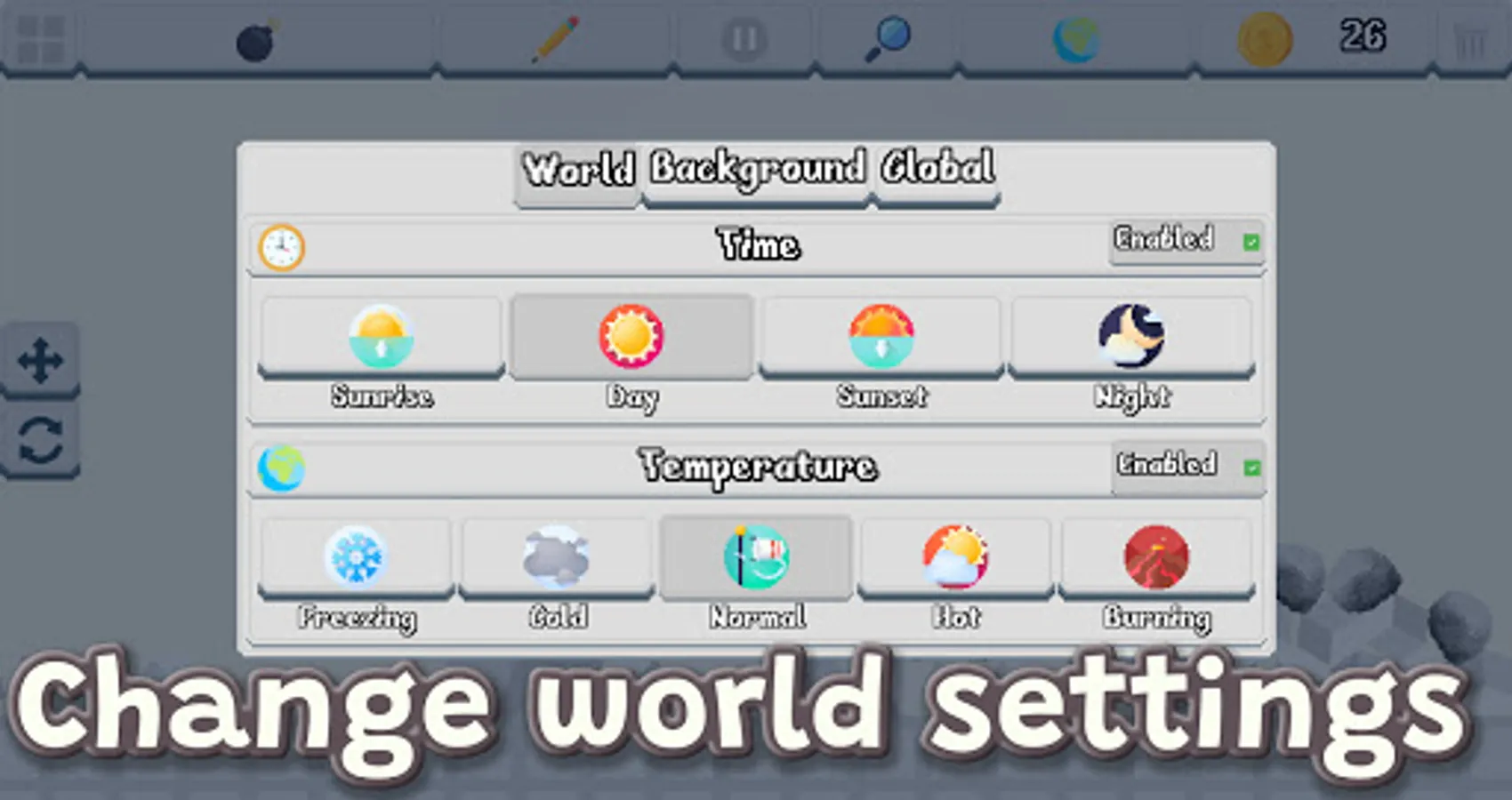 The globe button is the world settings. This menu allows you to change the world's appearance, day and night time and other settings, like friction and bounce.