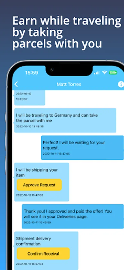 - Traveler will earn his service fee after confirming the parcel is sent and received