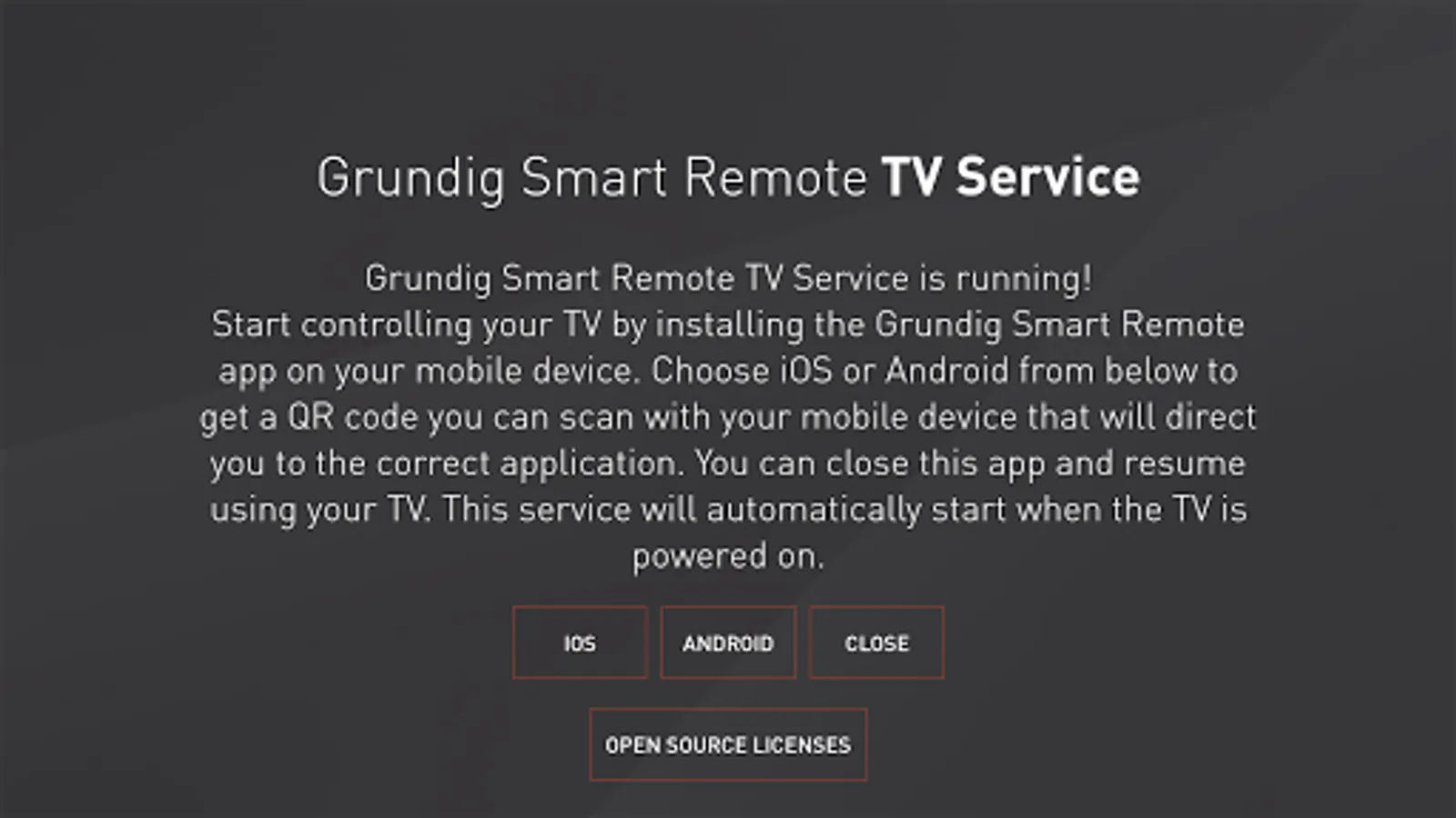 After you have installed "Grundig Smart Remote - TV Service" application on your TV, you need to start it only once. When the required services has started in the background successfully, "Grundig Smart Remote - TV Service has activated!" message will be displayed on the screen. From now on you can close the application to enjoy the TV, required services keep functioning in the background and they will be activated automatically on each TV boot up.
