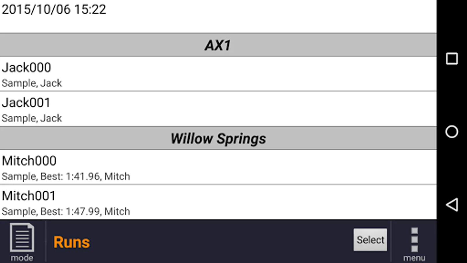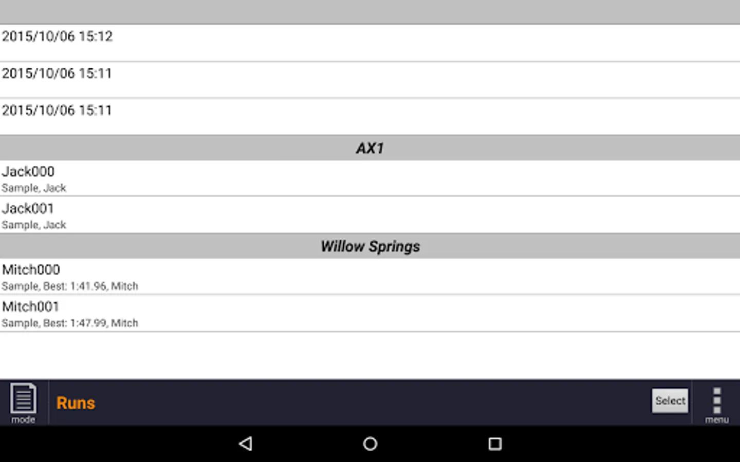 Recorded data is saved as Runs. Each Run starts when the vehicle exceeds 20MPH/33KPH and ends when the vehicle is moving slowly. The run includes several seconds of data before the recording trigger speed is reached. This way the start of an auto-cross run is included.