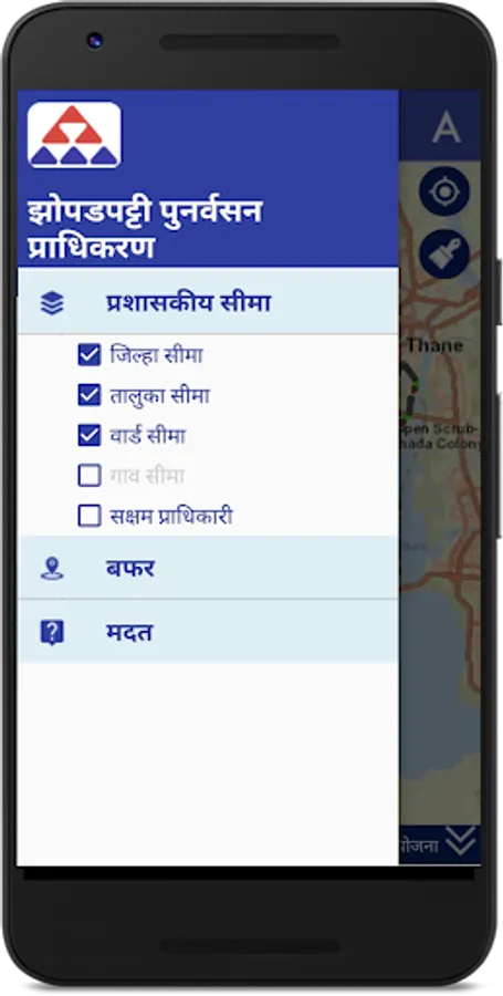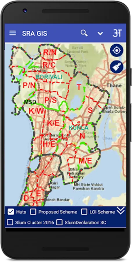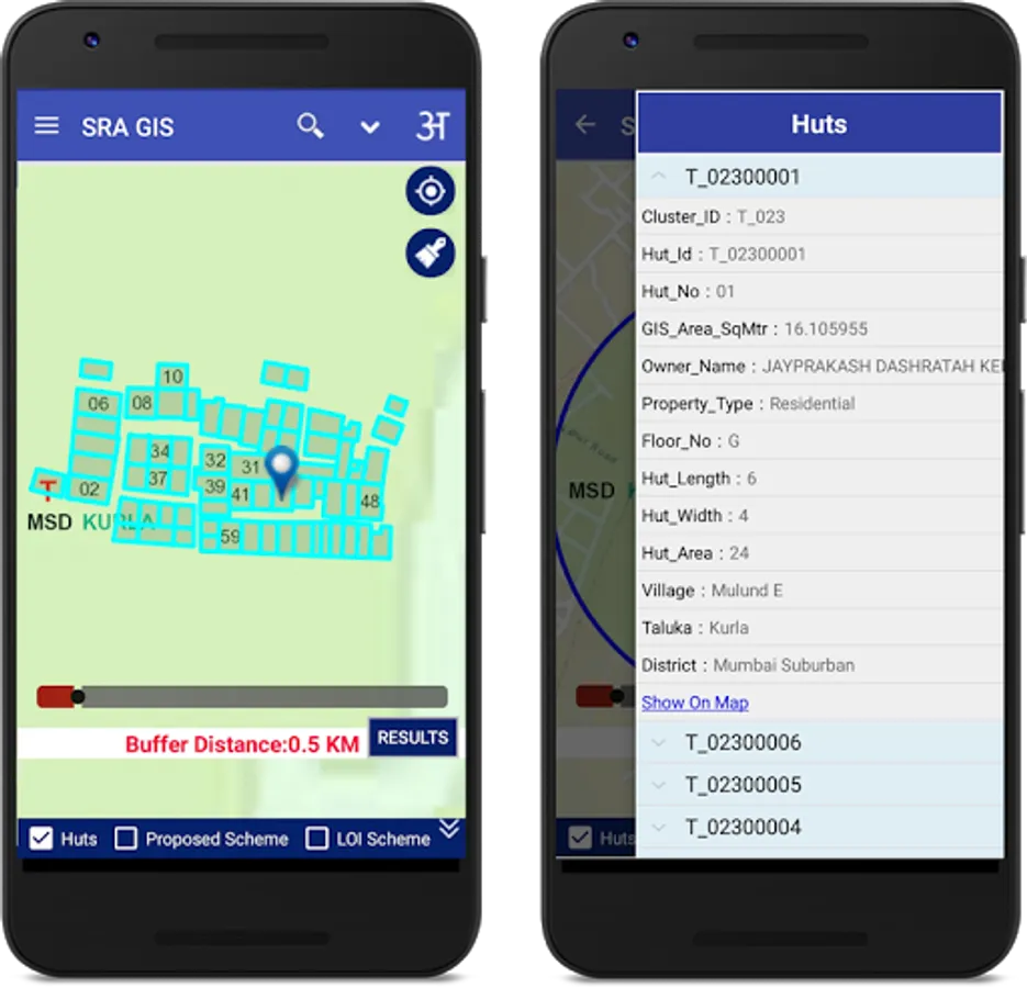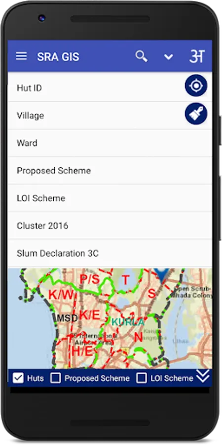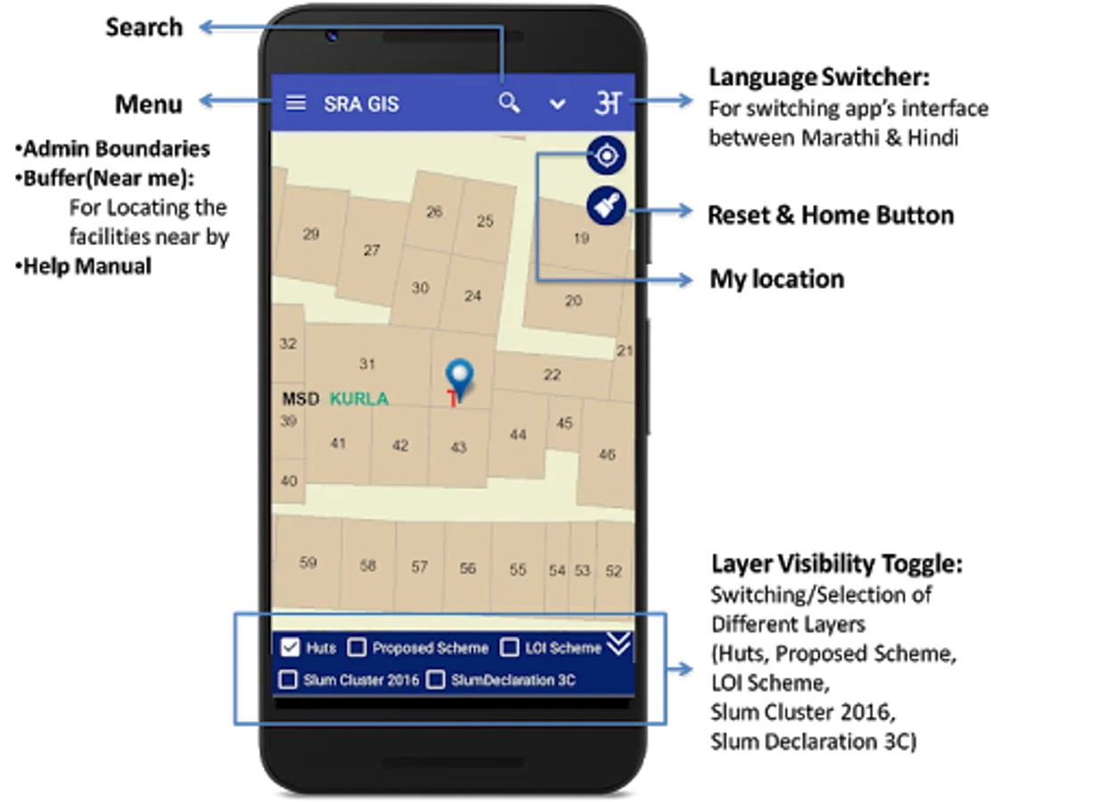 been created.This encompasses layers containing boundaries of District,Taluka, Ward,Village,Slum Cluster,SR Schemes, Huts,etc.This GIS Mobile App is developed with the support of Utility Mapping Division of NIC,New Delh