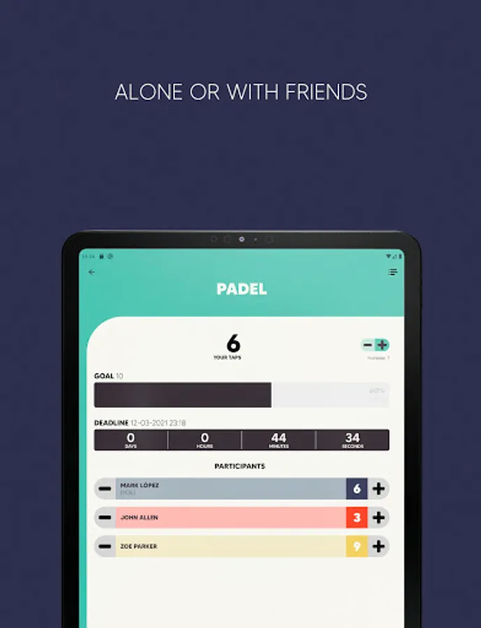 Challenge your friends and participate alone or by teams. The application is tailored to your needs; individual counters, group counters or team counters. Your choose.