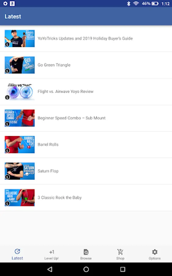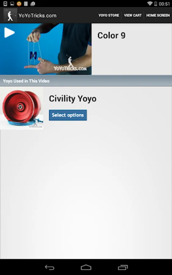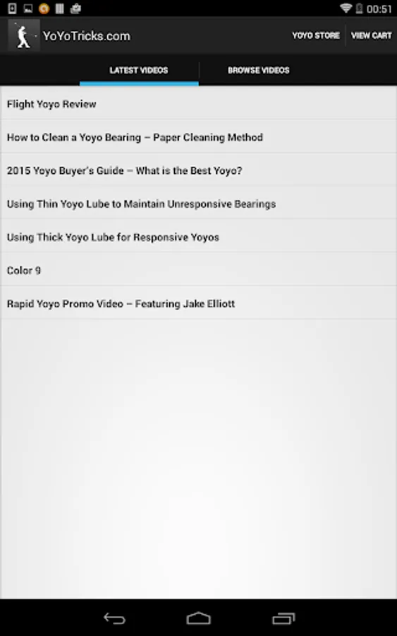 The YoYoTricks.com Android app allows user to quickly find any YoYoTricks.com video they want and stream it live. Videos also contain details about the recommended yoyo for learning the trick and make it easy for users to purchase that yoyo and browse our store for other products. Users can sign up or login to Level Up! to track progress and plan what tricks to learn next.