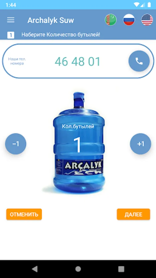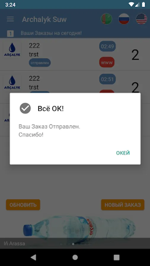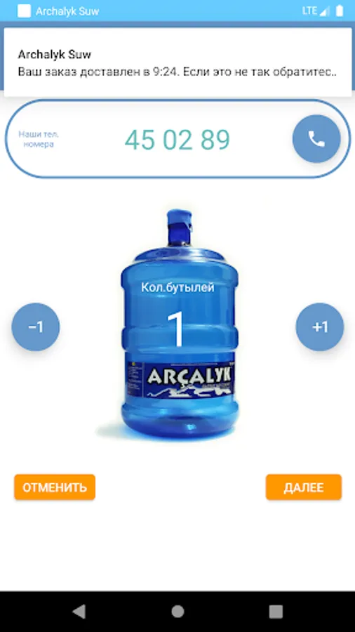 Application for ordering 19 liter bottles of Archalyk natural drinking water. Sending an order over the Internet. Tracking the status of orders sent over the Internet.