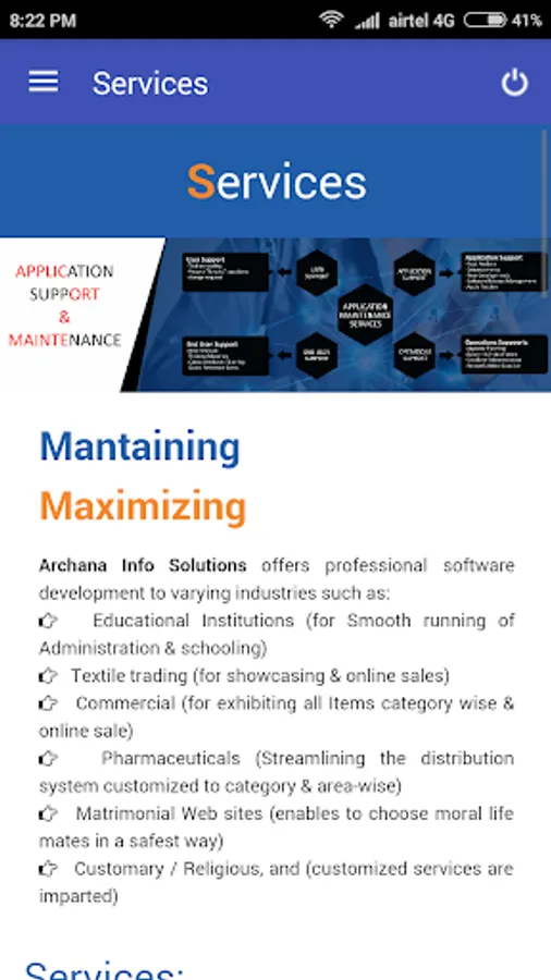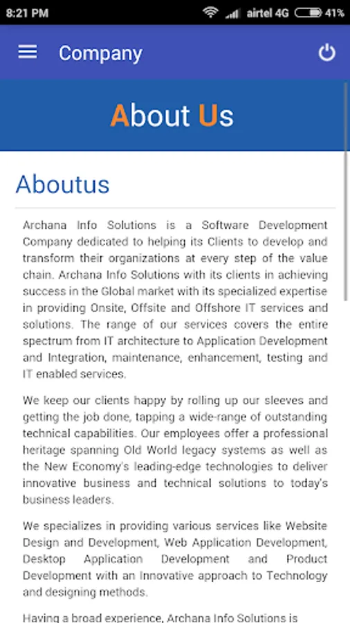 Archana Info Solutions is a Software Development Company dedicated to helping its Clients to develop and transform their organizations at every step of the value chain. Archana Info Solutions with its clients in achieving success in the Global market with its specialized expertise in providing Onsite, Offsite and Offshore IT services and solutions. The range of our services covers the entire spectrum from IT architecture to Application Development and Integration, maintenance, enhancement, testing and IT enabled services.