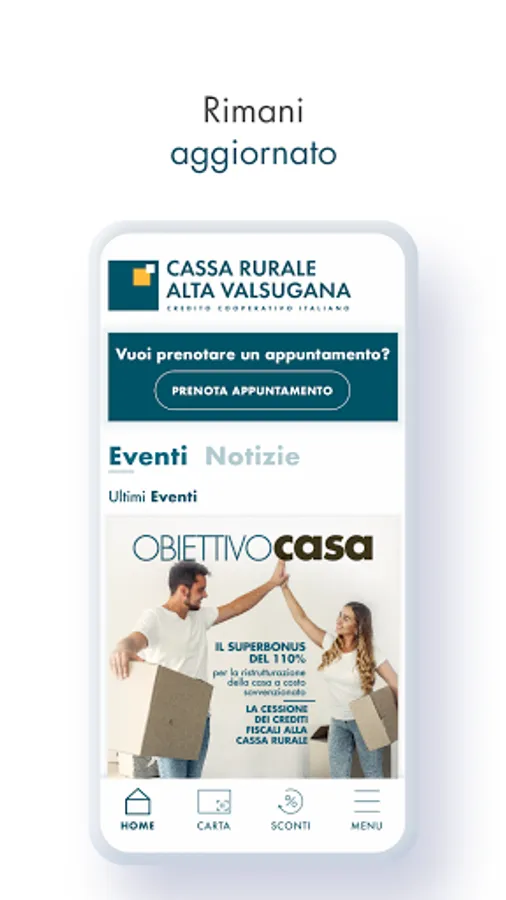 1. The app will make available, in a simple and timely manner, information on the initiatives and events organized by the Cassa Rurale. Through the app it will in fact be possible to be notified of the publication of all the news concerning our bank.
