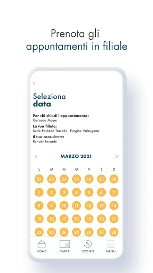 2. Through the app it will be possible to book appointments. The model of offering banking services in recent years has changed profoundly. The figure of the Consultant has become central in the Bank - Customer relationship and the organization of the Cassa Rurale has fully embraced this philosophy. Since 2018, all Clients have their own Consultant of reference and the method of accessing the Consultancy is organized almost exclusively by appointment. The pandemic in progress has made this process faster, so much so that it is now essential to schedule your meeting with the Consultant in advance. Through the app, all this will become even easier: it will be possible to find the indication of your reference Branch and your Consultant and request an appointment on the days and times available. Conveniently and quickly, through a notification, you will be notified of the acceptance of the request.