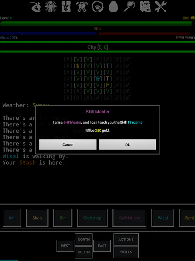 - skills like fire camp to cook raw food, vision to see monsters or villages close by, invisible to become invisible so that monsters don’t attack you!