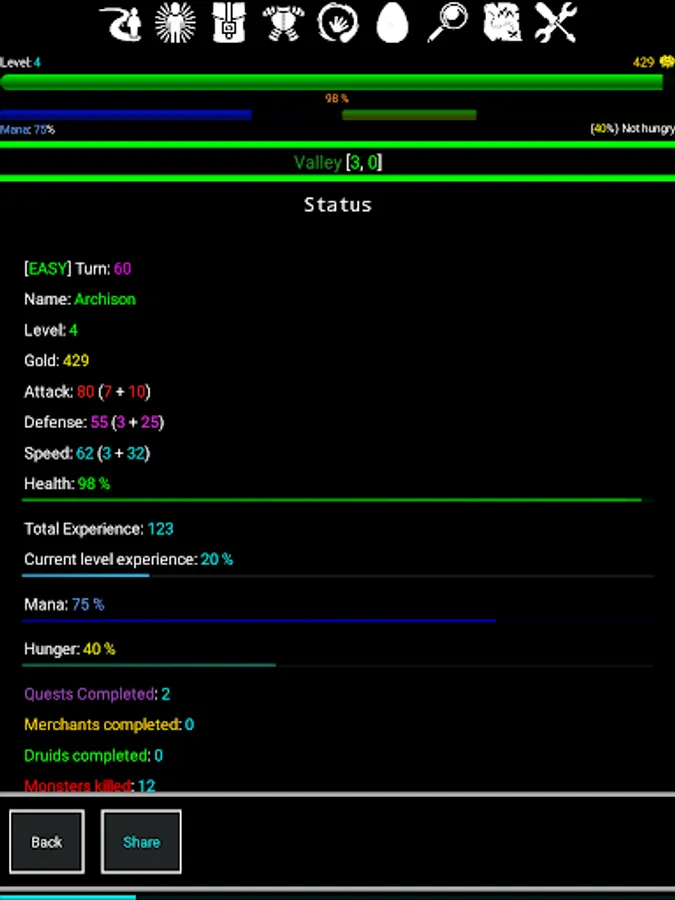 - main stats of attack, defense and speed which you can assign to your character in the beginning of the game and improve throughout your trip