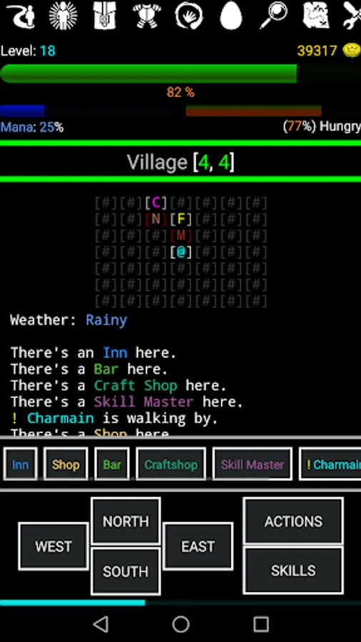 - villages where you can buy equipment, potions and tools at the shop; eat at the bar; rest at the inn; obtain craft recipes to start crafting; learn a skill from the skill master