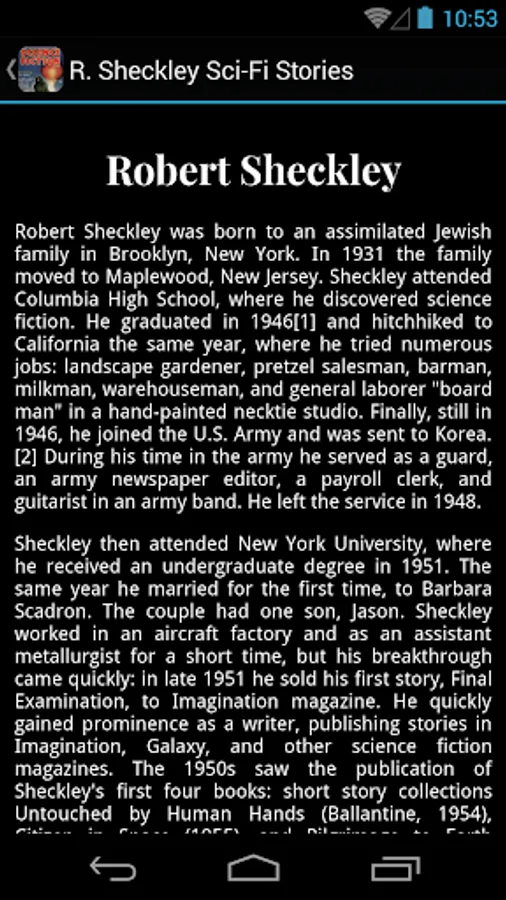 Robert Sheckley (July 16, 1928 - December 9, 2005) was a Hugo- and Nebula-nominated American author. First published in the science fiction magazines of the 1950s, his numerous quick-witted stories and novels were famously unpredictable, absurdist, and broadly comical. Sheckley was named Author Emeritus by the Science Fiction and Fantasy Writers of America in 2001.
