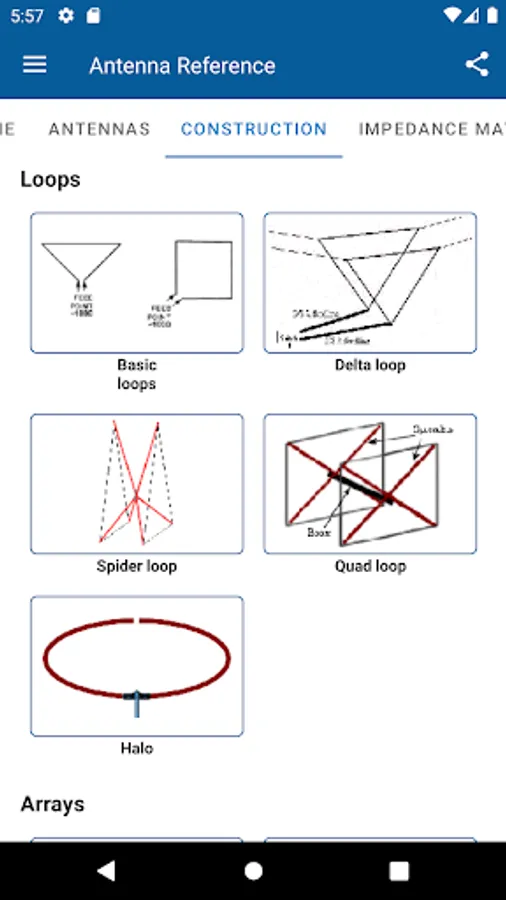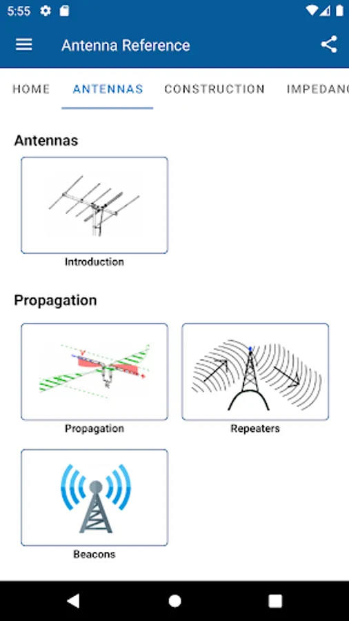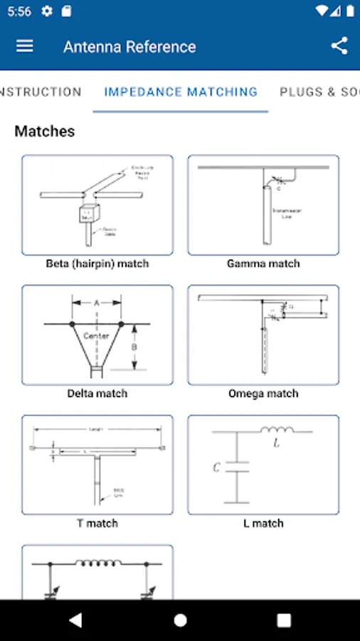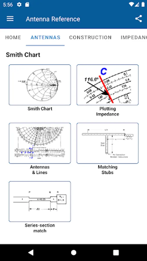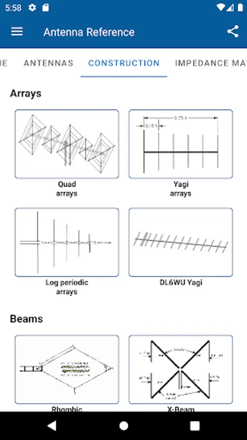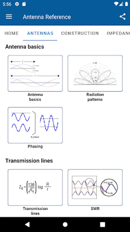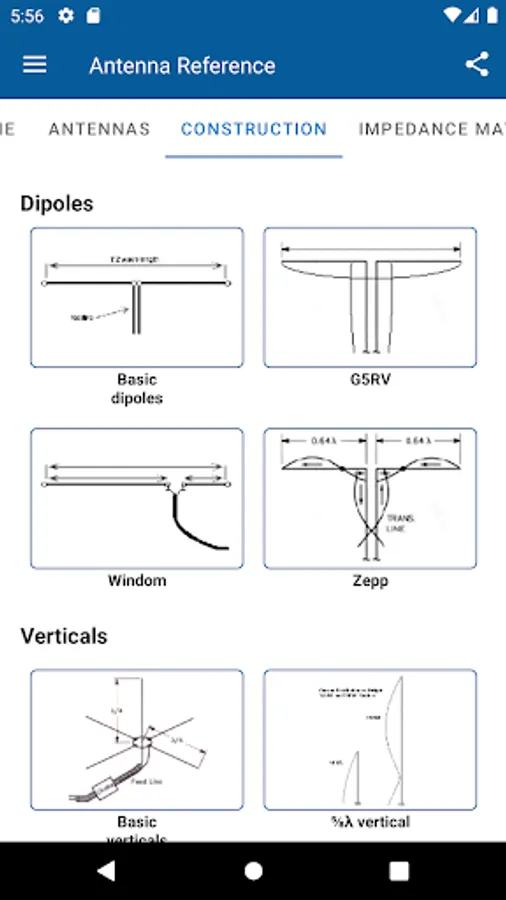 This App provides a comprehensive guide to antennas with a good selection of antennas to consider for construction. As well as the common dipole, 'V', Quad, Yagi and vertical antennas there are many others. The Discone, Windom, Zepp and J-Pole, the X-Beam and ZL Special - just to name a few. Also included are typical radiation patterns for each antenna, a wide range of impedance matching methods and a table of specifications for different coaxial cables and wire.
