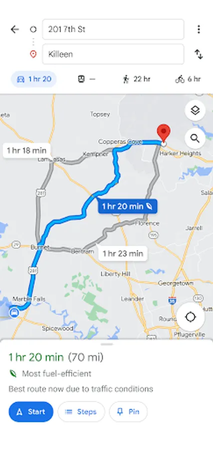 Locate the area you want to visit, press on the marker and you will be taken to a close up map of the city or area. Points of interest and local businesses are highlighted. Press on a point of interest and a panoramic view appears. Select Directions from the option menu, and the app will give you driving directions from you current location to the destination.