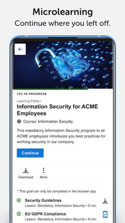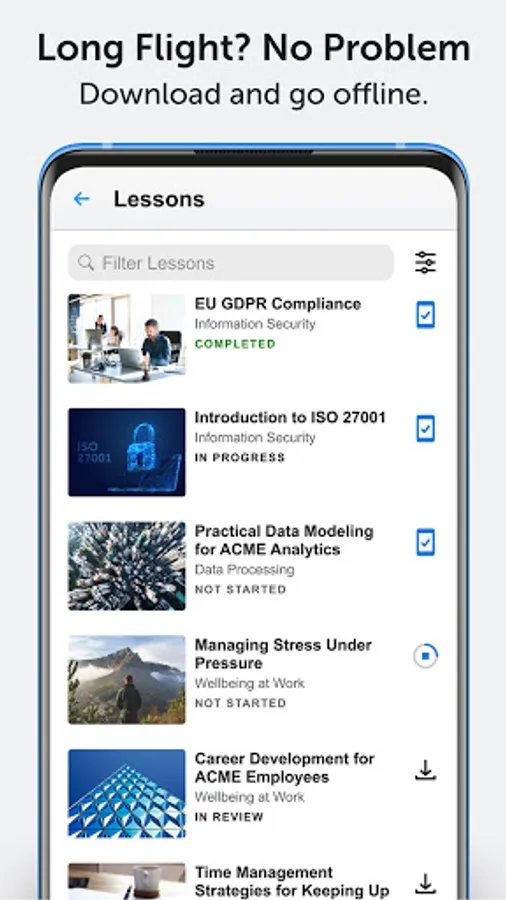 Available on any device, the Valamis Mobile App helps you view and complete your learning content anywhere you go. Use the Valamis Mobile App to: