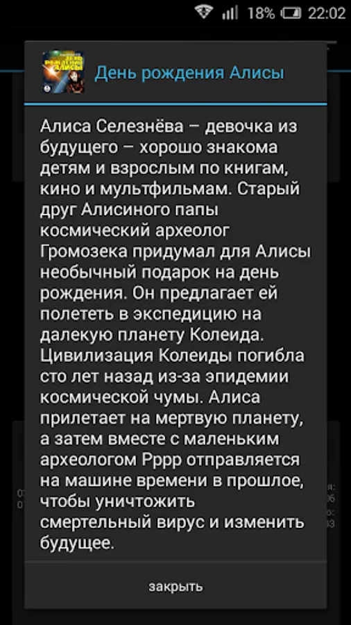 An old friend of Pope ALISIN space archaeologist Gromozeka came up to Alice's unusual birthday gift. He invites her to fly on an expedition to a distant planet Koleida. Civilization Koleidy died a hundred years ago because of the plague epidemic of space. Alice arrives at the dead planet, and then together with a small Rrrrr archaeologist goes on a time machine to the past in order to destroy a deadly virus and change the future.