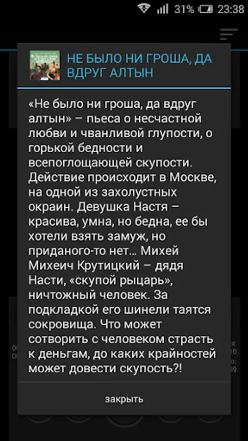 The action takes place in Moscow, one of the remotest suburbs. The girl Nastya - beautiful, intelligent, but poor, it would like to take in marriage, but the dowry is not present ... Micah Mikheich Krutitsy - Uncle Nasty, "The Miserly Knight" little man. For the lining of his overcoat concealed treasures. What can man do to passion for money, to what extremes can bring greed ?!