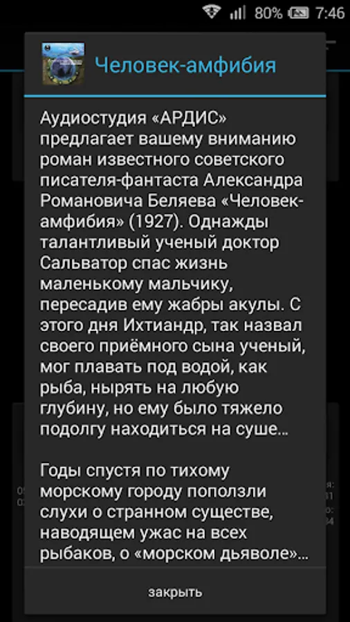 Audiostudiyu "ARDIS" offers you a novel of the famous Soviet science fiction writer Alexander Romanovich Belyaev, "Amphibian Man" (1927). Once a talented scientist, Dr. Salvatore saved the life of a little boy, he transplanted the shark gills. From that day Ichthyander, so named his adopted son scientist could swim under water like fish, dive to any depth, but it was hard for a long time to be on the land ...