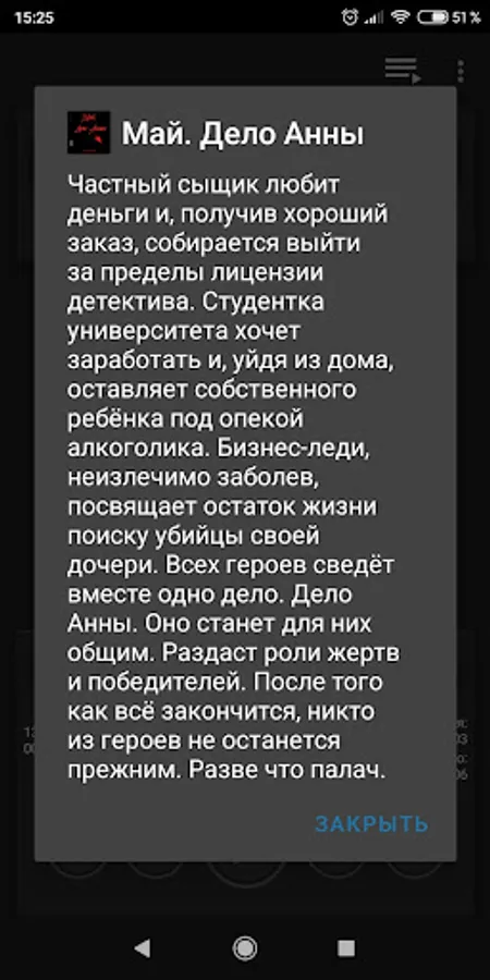 The private investigator loves money and, having received a good order, is about to go beyond the detective's license. A university student wants to earn money and, after leaving home, leaves her own child under the care of an alcoholic. A business woman, terminally ill, devotes the rest of her life to finding her daughter's killer. All heroes will be brought together by one thing. Anna's case. It will become common for them. Will distribute the roles of victims and winners. After it's over, none of the heroes will remain the same. Perhaps the executioner.