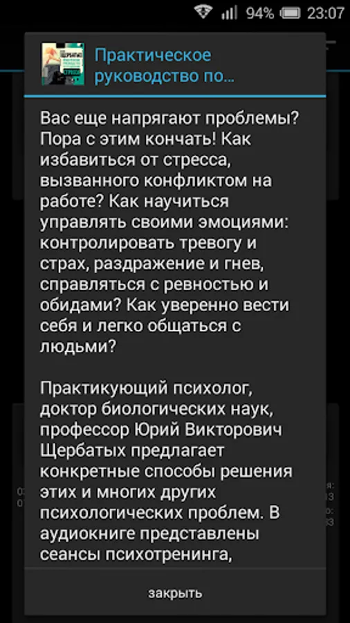 Practicing psychologist, Doctor of Biological Sciences, Professor Yury Shcherbatykh offers concrete solutions to these and many other psychological problems. The audiobook presents psycho sessions, exercises and assignments, provides a variety of methods: autogenous training, visualization, neuro-linguistic programming, muscle relaxation, breathing meditation techniques.
