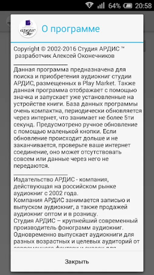 This program is designed to search for and purchase audio books from the ARDIS studio hosted on the Play Market.