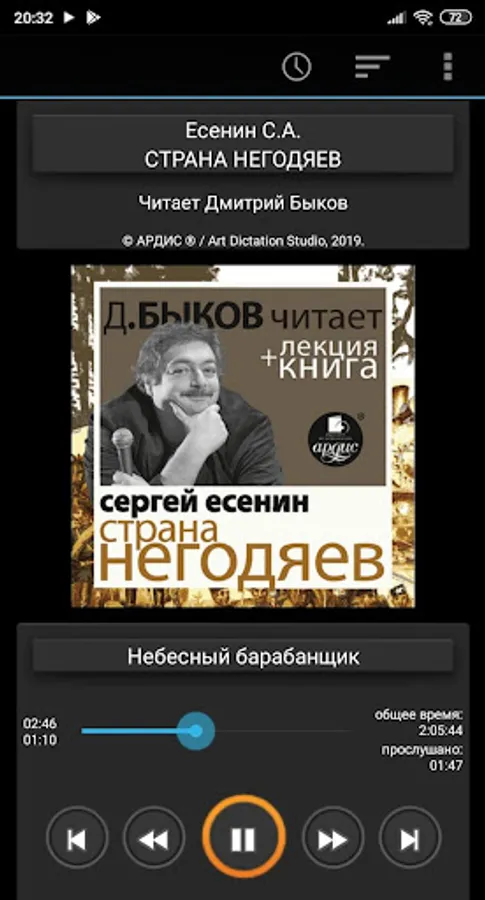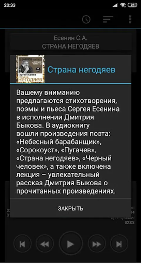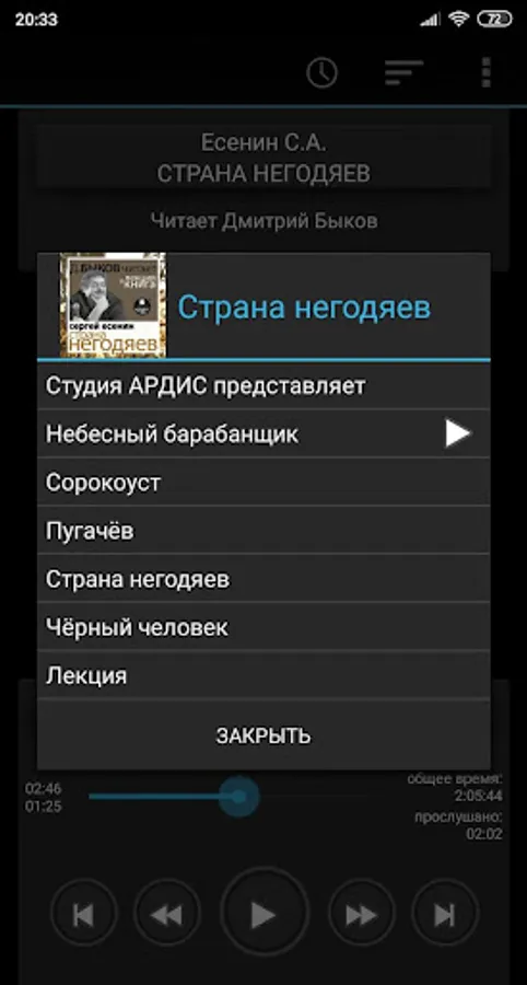 The audiobook includes the works of the poet: "Heavenly Drummer", "Sorokoust", "Pugachev", "Country of Scoundrels", "Black Man", and also included a lecture - a fascinating story by Dmitry Bykov about the read works.