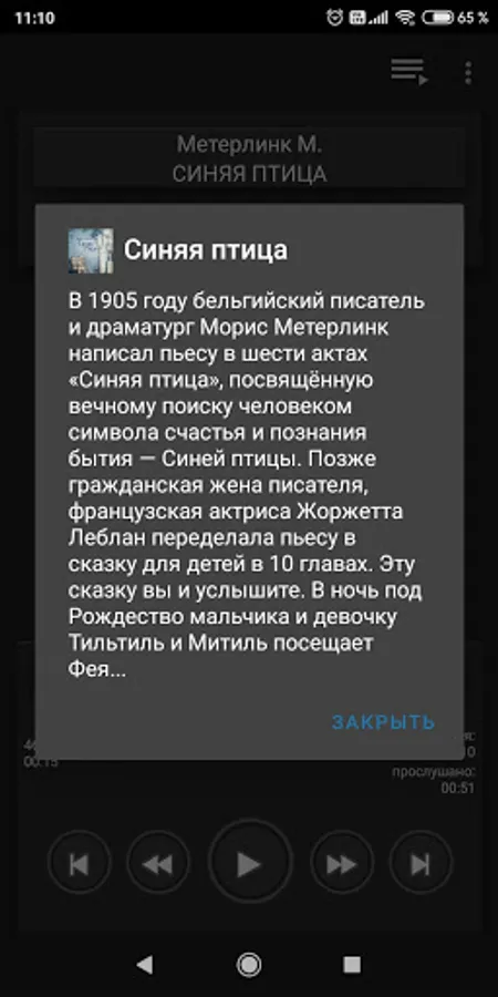In 1905, the Belgian writer and playwright Maurice Maeterlinck wrote a play in six acts "The Blue Bird", dedicated to the eternal search by man for the symbol of happiness and knowledge of life - the Blue Bird. Later, the common-law wife of the writer, French actress Georgette LeBlanc, remade the play into a fairy tale for children in 10 chapters. You will hear this tale.