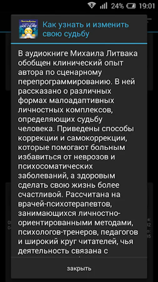 The audiobook Michael Litvak summarizes the clinical experience of the author of screenwriting reprogramming. It tells about the various forms of personal maloadaptivnyh complexes that determine the destiny of man. There are ways of correction and self-correction that help patients get rid of neuroses and psychosomatic diseases, and healthy to make their lives happier. Designed for psychotherapists physicians involved in student-centered methods, psychologists, trainers, teachers and a wide range of readers, whose activities are connected with intensive communication or dissatisfied him.
