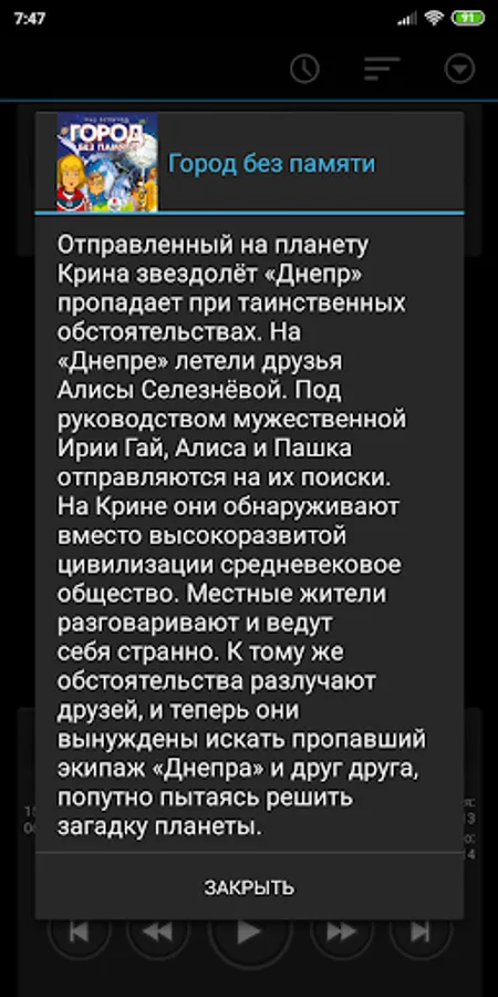 The Dnepr starship sent to the planet Krin disappears under mysterious circumstances. Friends of Alisa Selezneva flew to the Dnieper. Under the guidance of the courageous Iria, Guy, Alice and Pashka set off in search of them. Instead of highly developed civilization, they find medieval society on Kryn. Locals talk and behave strangely. In addition, circumstances separate friends, and now they are forced to look for the missing crew of the Dnepr and each other, simultaneously trying to solve the mystery of the planet.