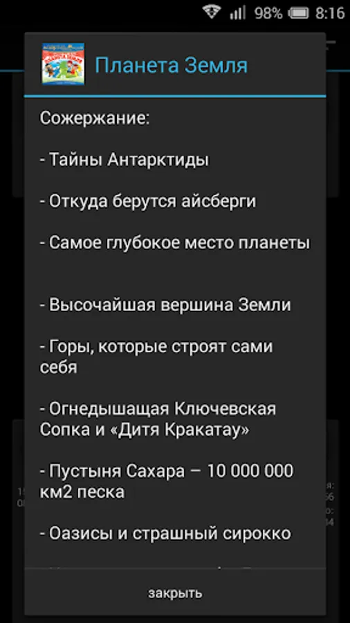 Series OUR PLANET includes four discs, listening to the children will learn a lot about the amazing planet Earth on which we live: on the continents and oceans, mountains and deserts, avalanches and earthquakes, volcanoes and sea currents, a rare and mysterious phenomena of nature and many other things .