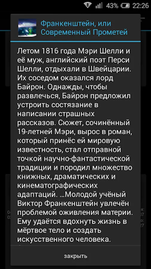 In the summer of 1816, Mary Shelley and her husband, the English poet Percy Shelley, vacationing in Switzerland. Their neighbor was a Lord Byron. One day, to have fun, Byron suggested a writing competition in the scary stories. The plot is composed by 19-year-old Mary, grew up in the novel that brought her worldwide fame, was the starting point of the science-fiction tradition and spawned dozens of books, drama and film adaptations. ... Young scientist Victor Frankenstein keen on reviving the problem of matter. He manages to breathe life into a dead body and create an artificial human. However, his work is an ugly monster that chases its creator ...