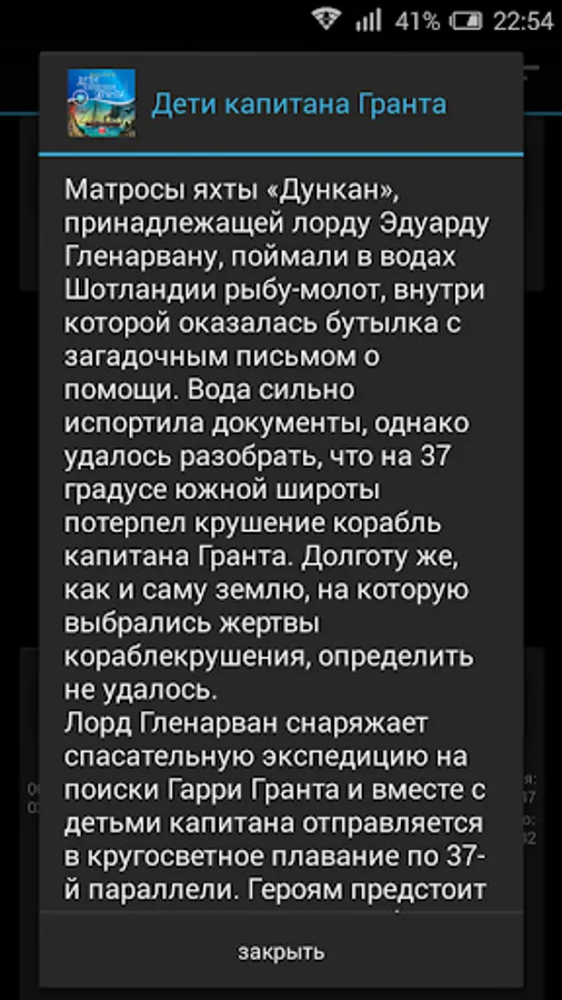 The sailors yacht "Duncan", owned by Lord Edward Glenarvanu, caught in the waters of Scotland hammerheads, inside which there was a bottle with a mysterious letter for help. Water strongly spoiled papers, but could make out, which is 37 degrees south latitude wrecked ship of Captain Grant. Longitude same as the earth itself, which got a shipwreck victim could not be determined.