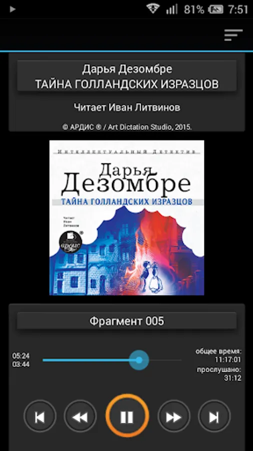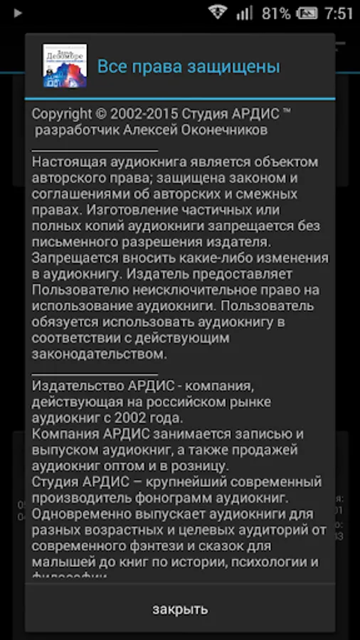 Making partial or complete copies of the audiobook is prohibited without the written permission of the publisher. It does not make any changes in the audiobook. Publisher grants the User a non-exclusive right to use audiobooks.